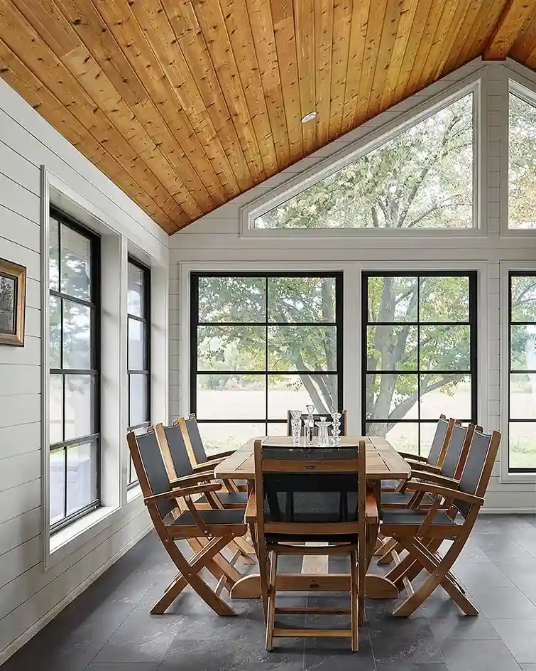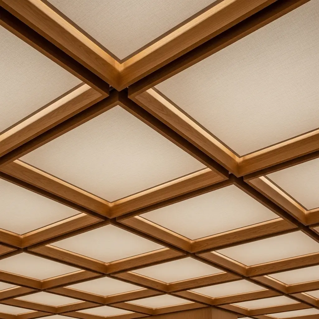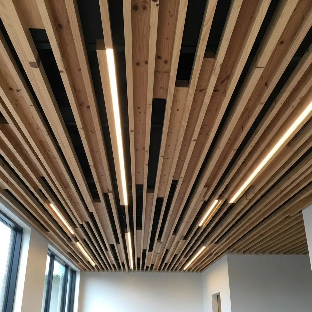 This modern design uses less wood. Air circulation improves naturally. The geometric pattern adds interest. Installation is faster than solid coverage. This technique complements tray ceiling ideas nicely.