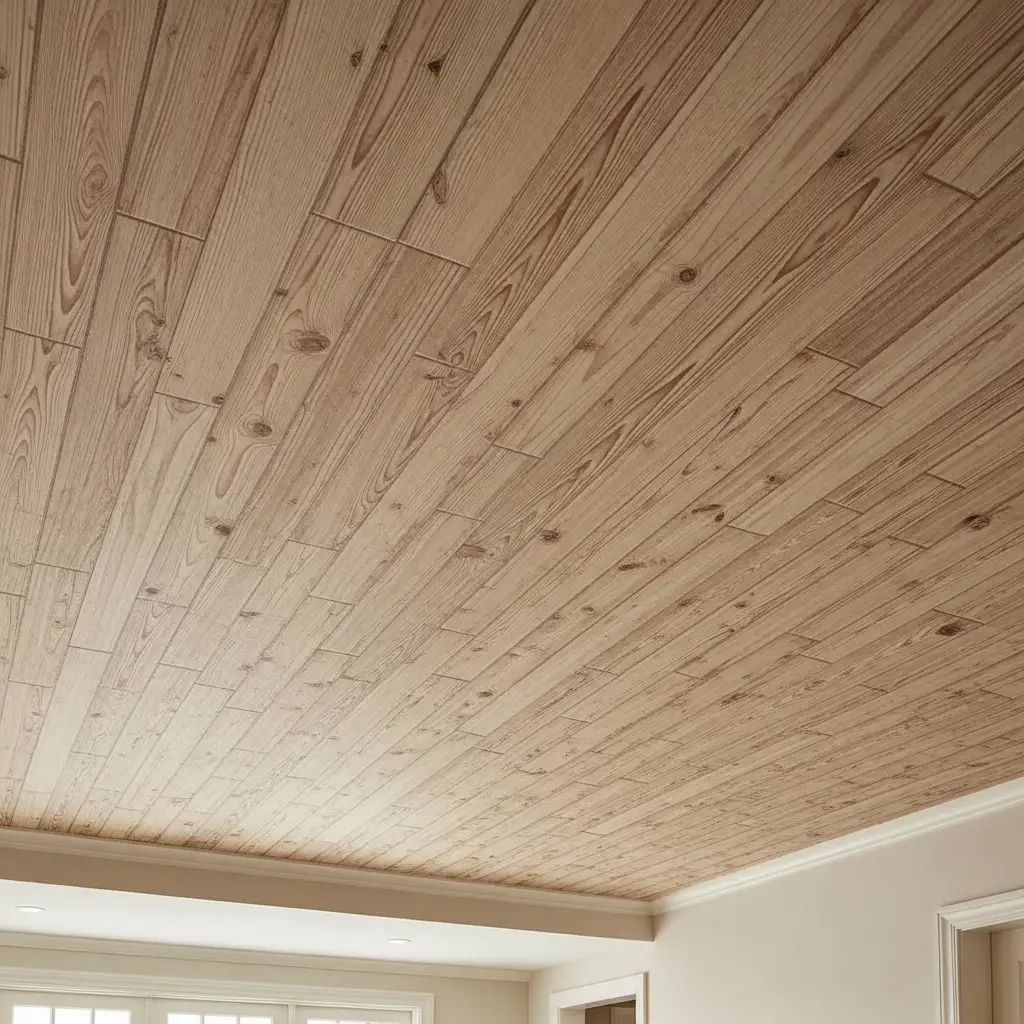 Veneer gives you the wood look without heavy weight. It installs with adhesive backing. This option works great for cheap DIY ceiling ideas on a tight budget.
