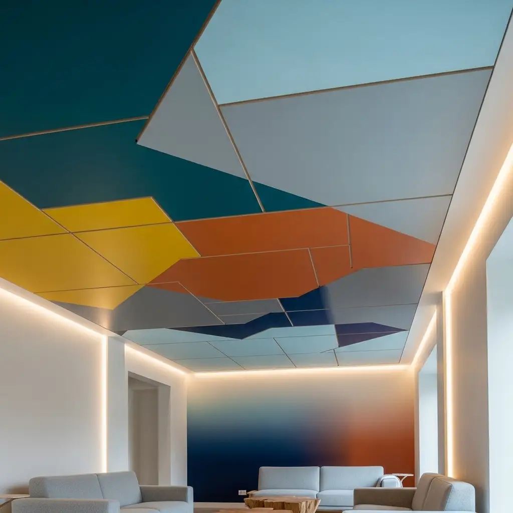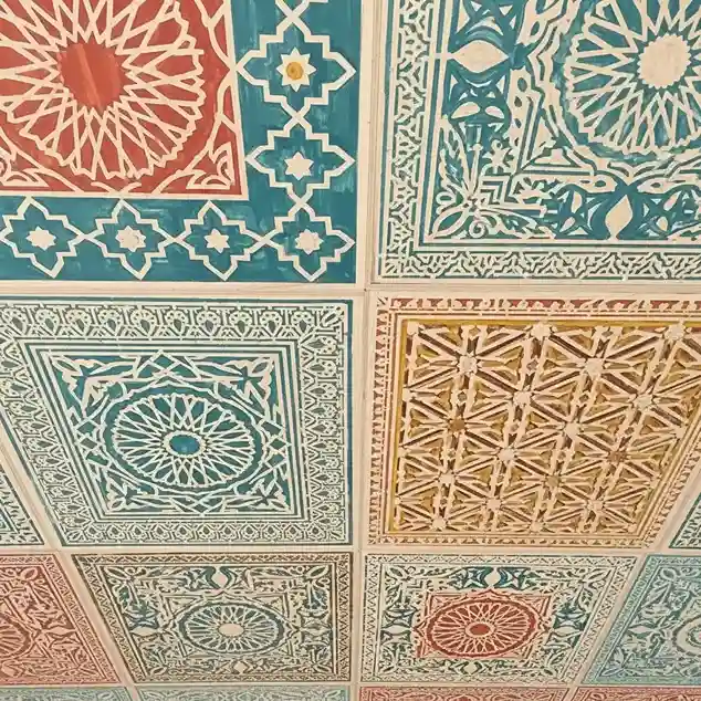 Geometric patterns work best. Moroccan or tribal designs look stunning. The technique is simple. Your ceiling becomes unique art.