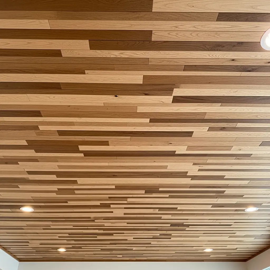 Old hardwood flooring works on ceilings. Check renovation sites for scraps. Flooring is durable and attractive.