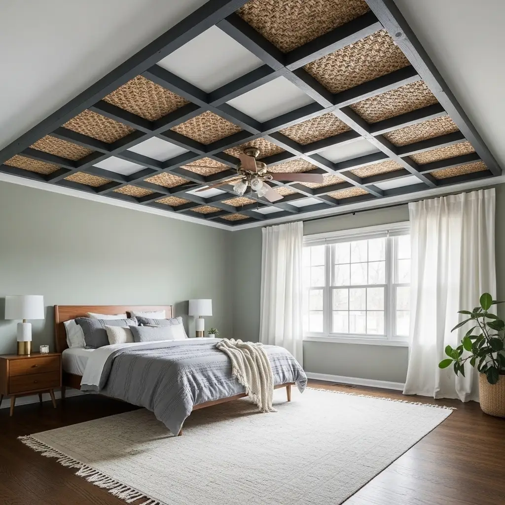 Vinyl plank flooring works on ceilings. It costs $1 to $3 per square foot. Installation is quick and easy. Perfect for integrating with bedroom paint colors schemes.
