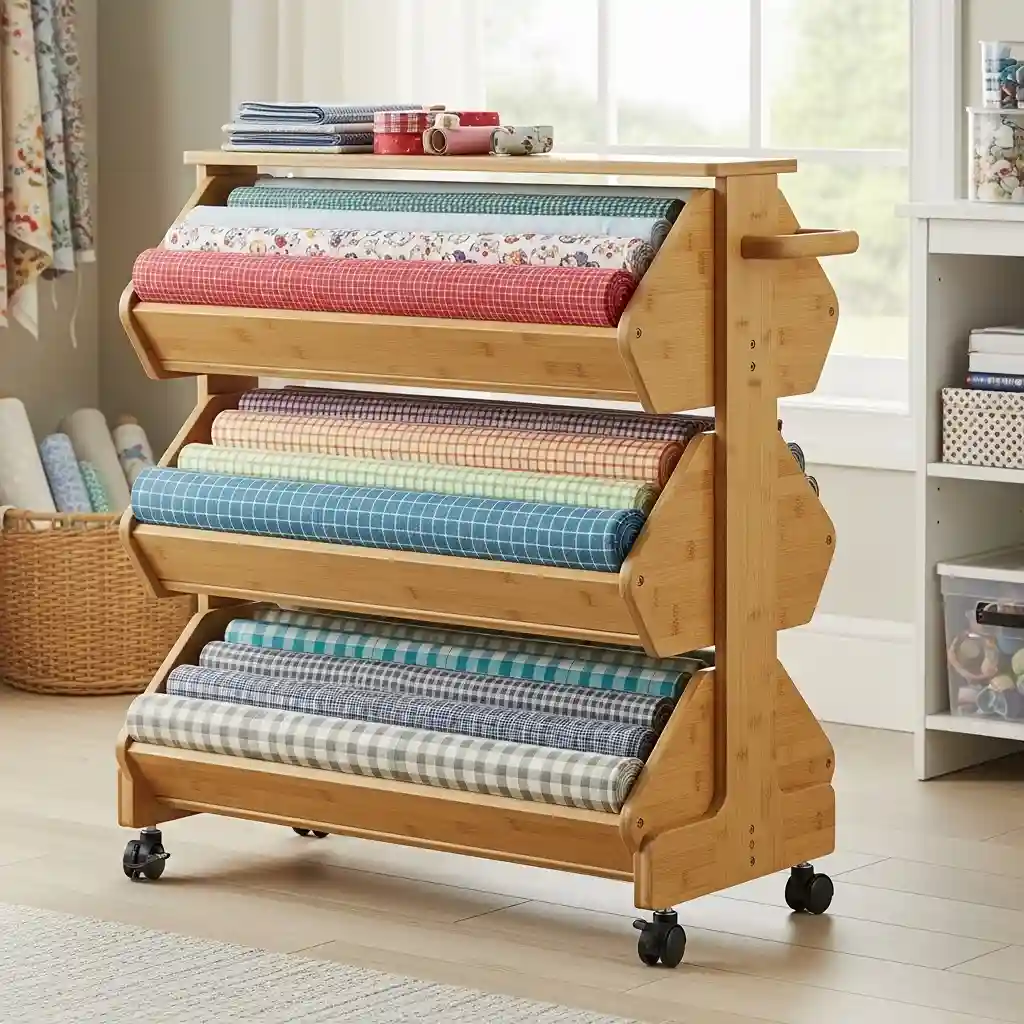 Three-tier rolling wire carts offer mobile fabric storage convenience. Store folded fabrics in labeled bins on each shelf. Roll the cart wherever you’re working that day easily. The open wire design allows air circulation preventing mustiness. Mobile solutions similar to multipurpose rooms ideas adapt to changing needs.