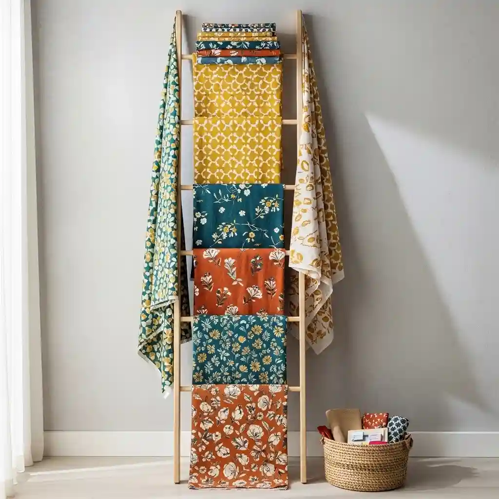 Rotate fabrics regularly showcasing your growing collection beautifully. The ladder stores flat against wall saving floor space. Paint the ladder matching your room’s color scheme. This functional decor piece inspires creativity daily while storing fabrics.