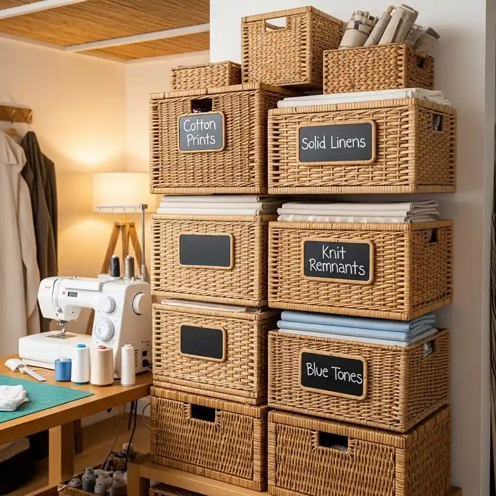 Stack woven baskets creating vertical fabric storage towers. Each basket holds specific fabric types or color families. The natural material adds warmth to your sewing space. Label baskets with chalkboard tags for easy identification. Natural materials like drop ceiling ideas create warm inviting environments.