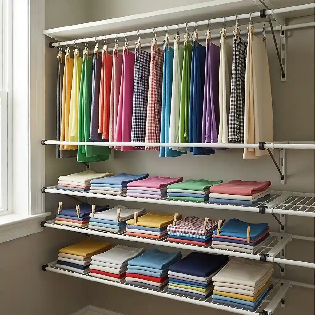 Organize fabrics by season keeping current fabrics most accessible. The tension rods adjust to any closet width easily. Remove rods quickly when changing storage configurations later. This flexible system grows with your fabric collection naturally.