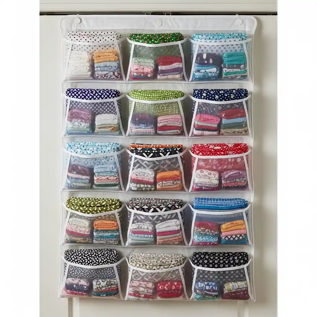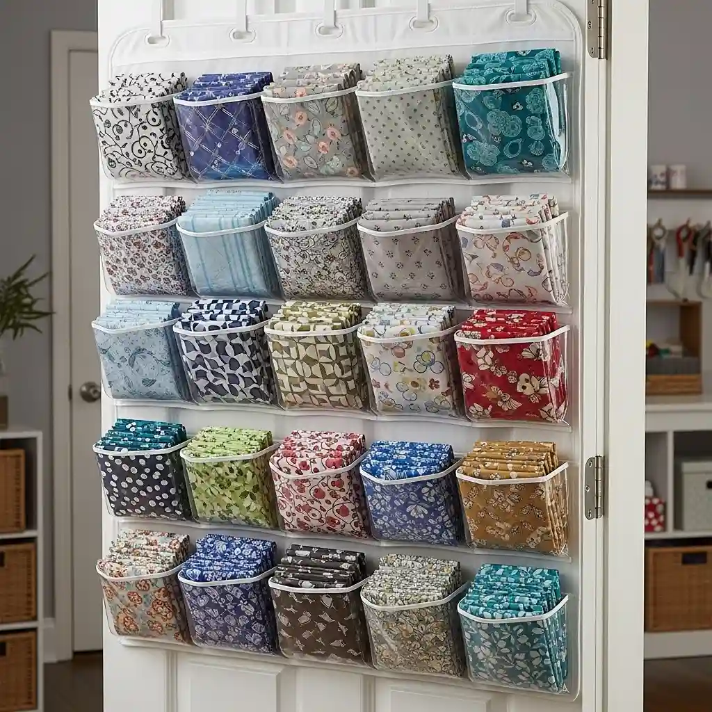 Hang clear over-the-door shoe organizers for fat quarter storage. Each pocket perfectly holds one fat quarter or fabric scrap. The transparent pockets let you see every fabric instantly without digging. Mount several organizers side-by-side for extensive fabric collections today. Similar organizational principles from home interior decoration ideas apply to craft spaces too.