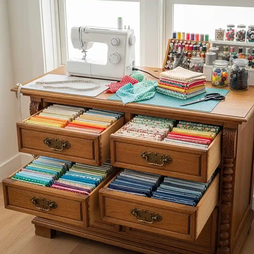 Convert vintage dressers into charming fabric storage pieces beautifully. Each drawer holds fabrics sorted by color or type. The furniture piece adds character to your sewing room. Top surface provides additional workspace or display area too. Vintage pieces like bedroom category furniture add personality affordably.