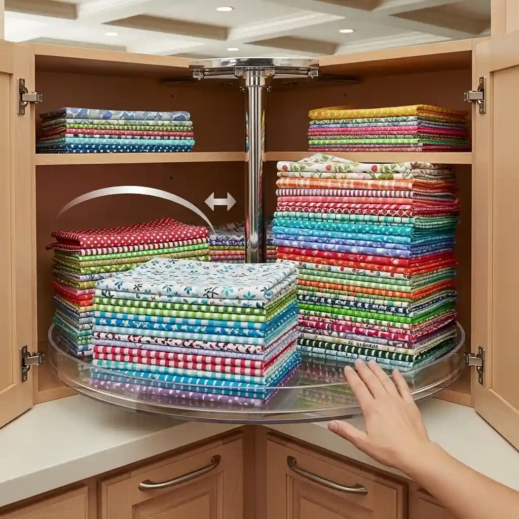 Use multiple lazy susans at different shelf heights. Organize fabrics by color on each rotating platform. The smooth rotation makes selection effortless and quick. Install in existing cabinets without permanent modifications needed.