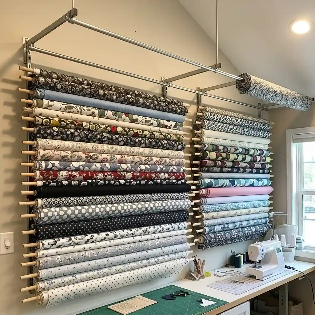 Install closet rods or dowels horizontally on walls specifically. Thread fabric bolts onto rods displaying them like stores. This professional storage keeps fabrics wrinkle-free and accessible always. The visible display inspires creativity and project planning daily. Professional systems like vaulted ceiling guide maximize functionality beautifully.