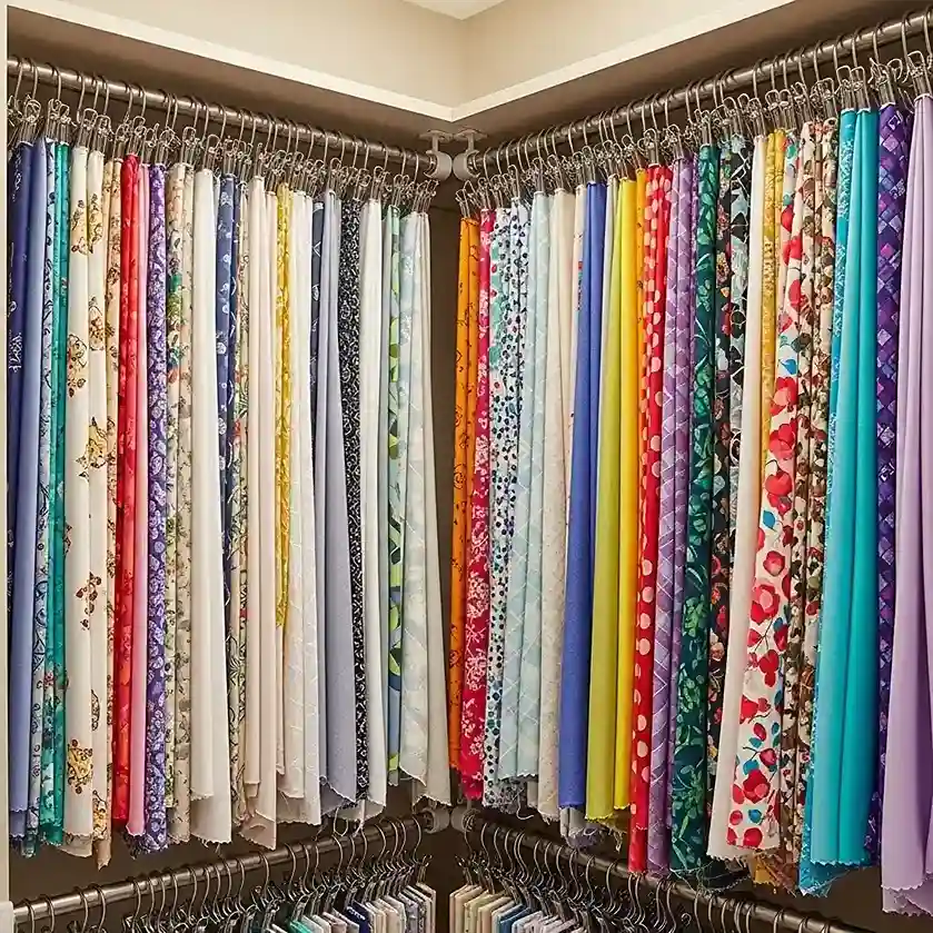 Install tension curtain rods inside closets or on walls. Clip fabric pieces using binder clips or clothespins directly. This prevents wrinkles while displaying your fabric beautifully openly. You can see your entire collection without unfolding anything. Creative solutions like those in living room category maximize vertical space perfectly.