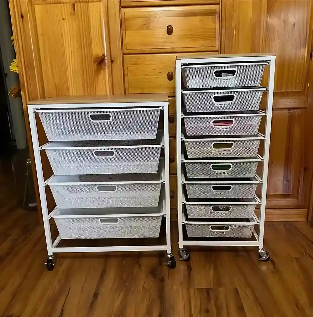 Stack multiple towers creating extensive storage capacity easily. Label each drawer with fabric type and yardage. The lightweight construction allows easy repositioning when needed. Wheels on some models add extra mobility convenience.
