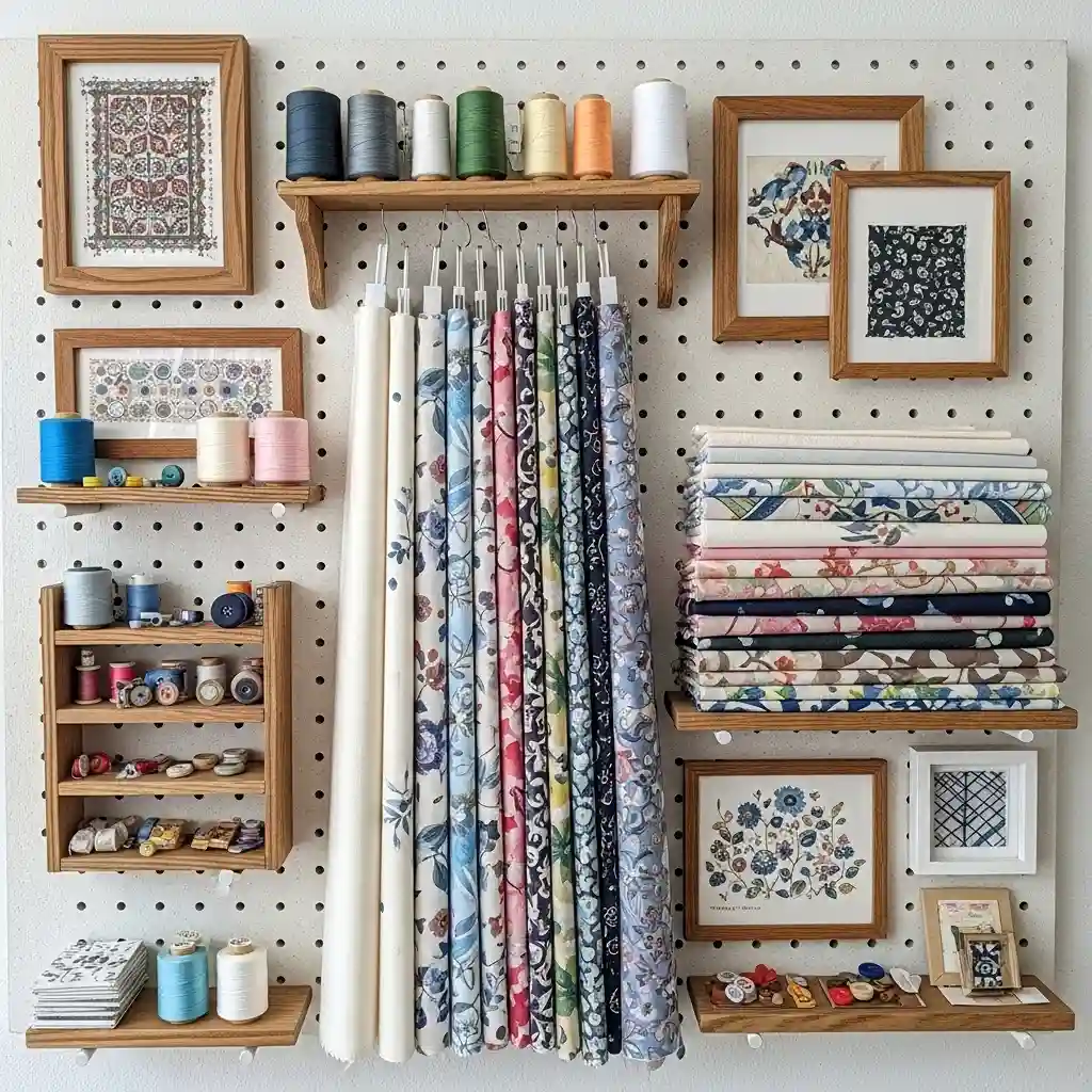 Paint the pegboard to match your room decor perfectly. Arrange fabrics by color for maximum visual impact daily. The open display keeps fabrics wrinkle-free and accessible always. Add small bins on hooks for notions and small scraps.