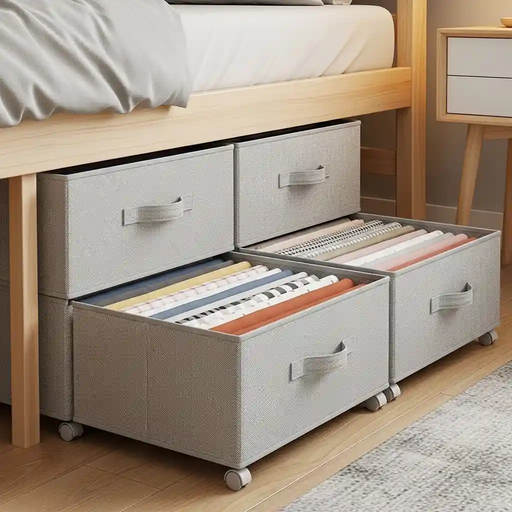 Utilize wasted under-bed space with rolling fabric drawers. Shallow drawers slide out easily for fabric access anytime. Store folded fabrics lying flat preventing deep wrinkles completely. The enclosed drawers protect from dust and pet hair. Hidden storage similar to bathroom ideas maximizes every available space inch.