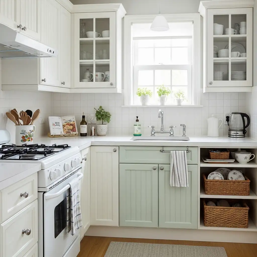 Light-colored cabinets, especially in creamy whites, soft blues, or pale greens, are a hallmark of cottage style. They reflect light, making a small kitchen feel brighter and more open.