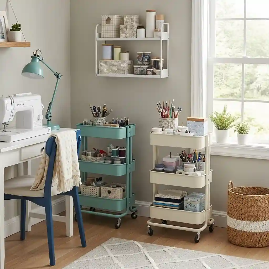Use narrow carts for thread collections organizing by color on each shelf. Store scissors, rotary cutters, and rulers in narrow carts beside cutting area. Keep current project supplies in mobile cart rolling between sewing and ironing. These slim carts maximize overlooked narrow spaces making them functional storage areas.