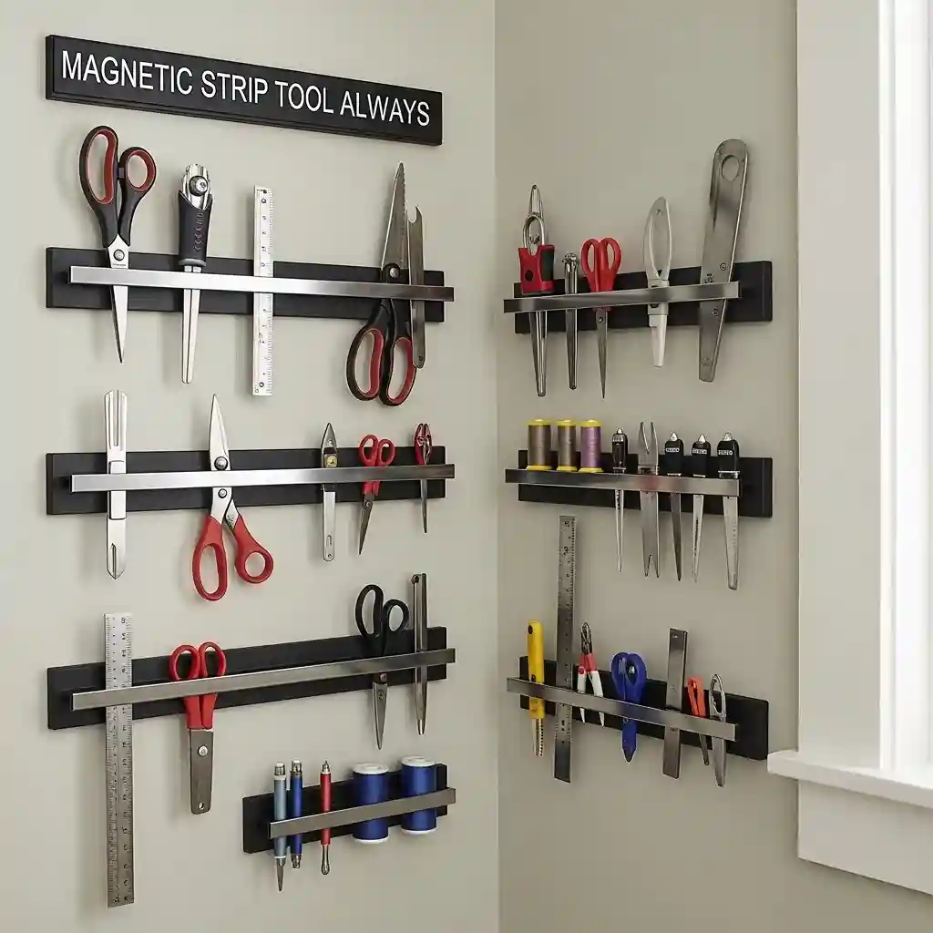 Position magnetic strips near sewing machine keeping frequently used tools within reach. Mount one strip beside cutting area holding rotary cutters and scissors readily. Add magnetic strips inside cabinet doors creating hidden tool storage conveniently. The visual display helps you quickly identify which tools are available versus in use.