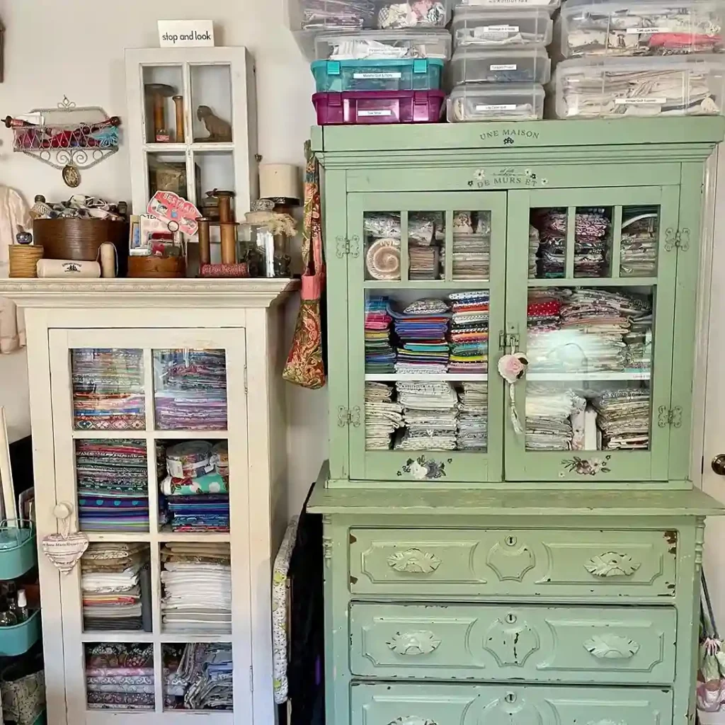 Fill some cubes with storage bins containing organized fabric by color. Leave some cubes open displaying prettiest fabrics or decorative sewing items. Add doors to select cubes hiding messy supplies while maintaining accessibility. This system provides maximum storage flexibility in minimal floor space footprint.