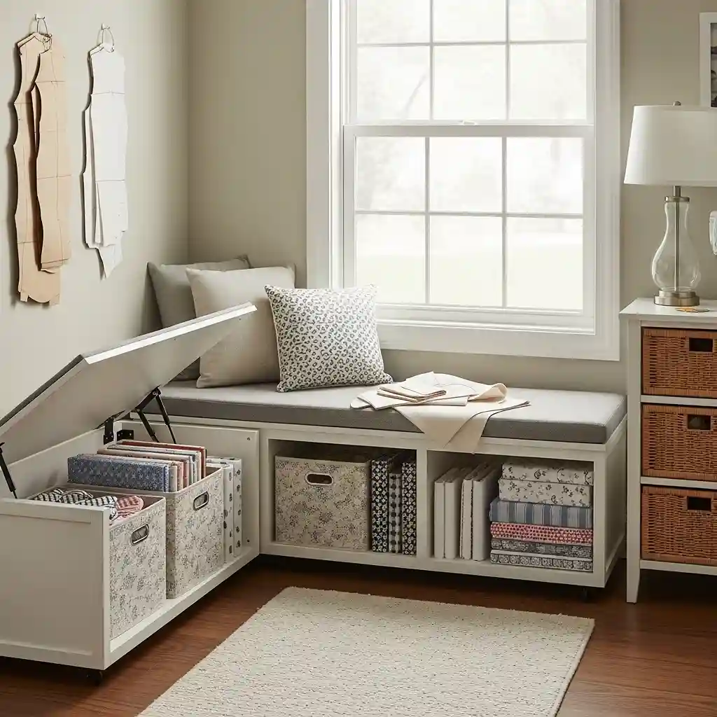 Choose furniture serving double or triple functions maximizing limited space brilliantly today. A dining table becomes a cutting table with protective mat on top. Storage ottomans provide seating plus fabric storage inside hidden compartments conveniently. Bookcases with doors hide sewing supplies while displaying decorative items openly. Versatile furniture like multipurpose rooms ideas adapts to activities.