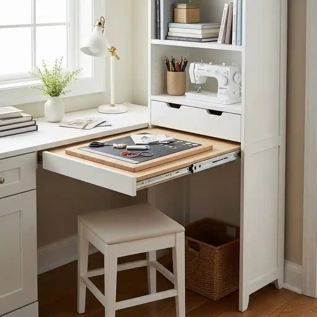 Install ball-bearing slides ensuring smooth quiet extension and retraction movement always. Use extension for cutting smaller projects or as temporary pressing surface. The slide-out feature creates workspace exactly when needed without permanent commitment. This flexibility makes small sewing spaces adapt to various project requirements easily.