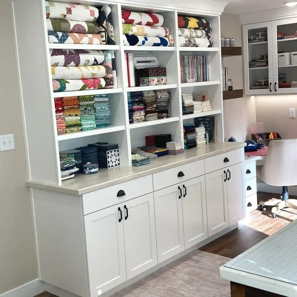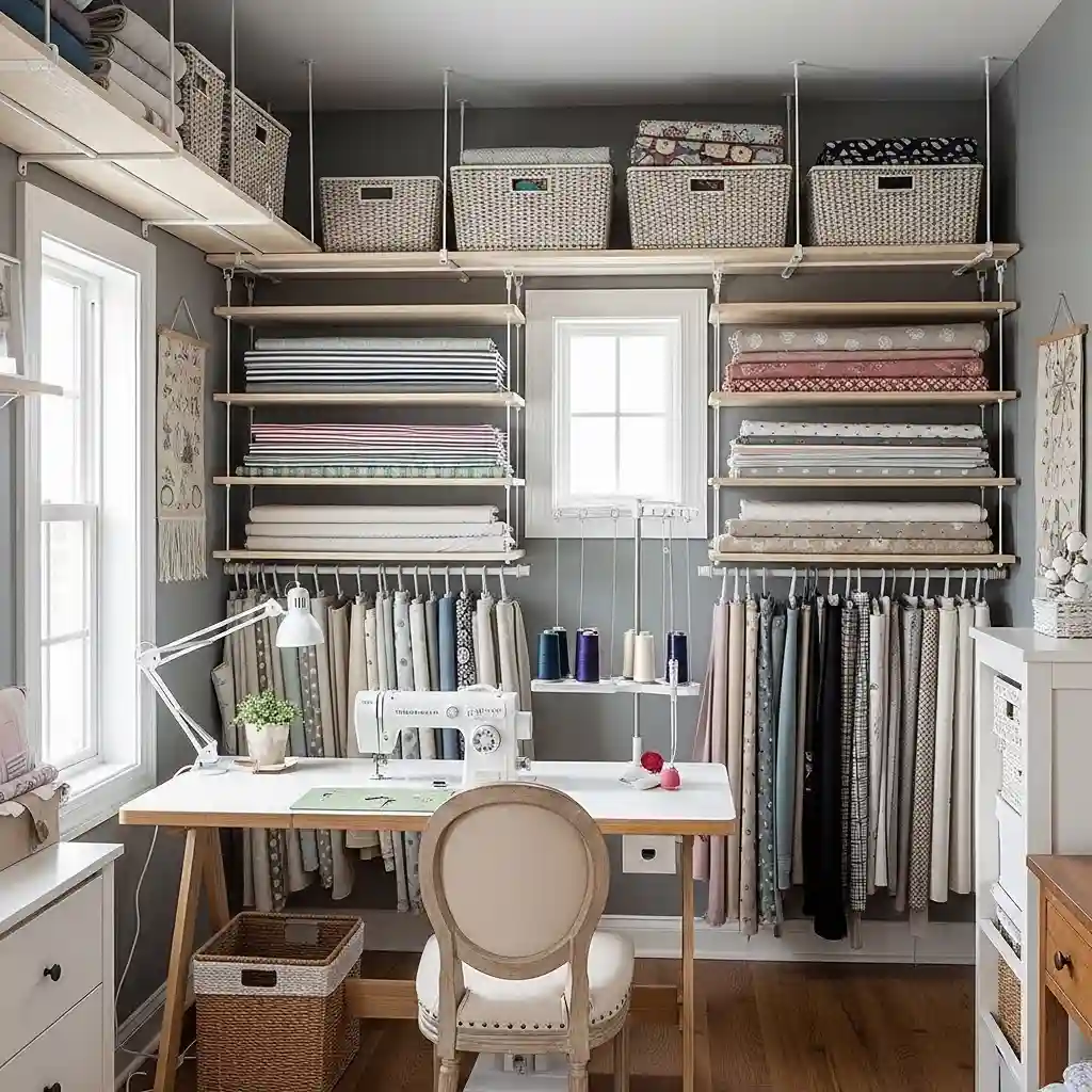 Use the highest shelves for seasonal fabrics or rarely used specialty supplies. Install medium-height shelves for fabric storage organized by color or project. Lower shelves hold thread, notions, and tools used in daily sewing projects. This vertical approach maximizes storage without consuming valuable floor space needed for working.