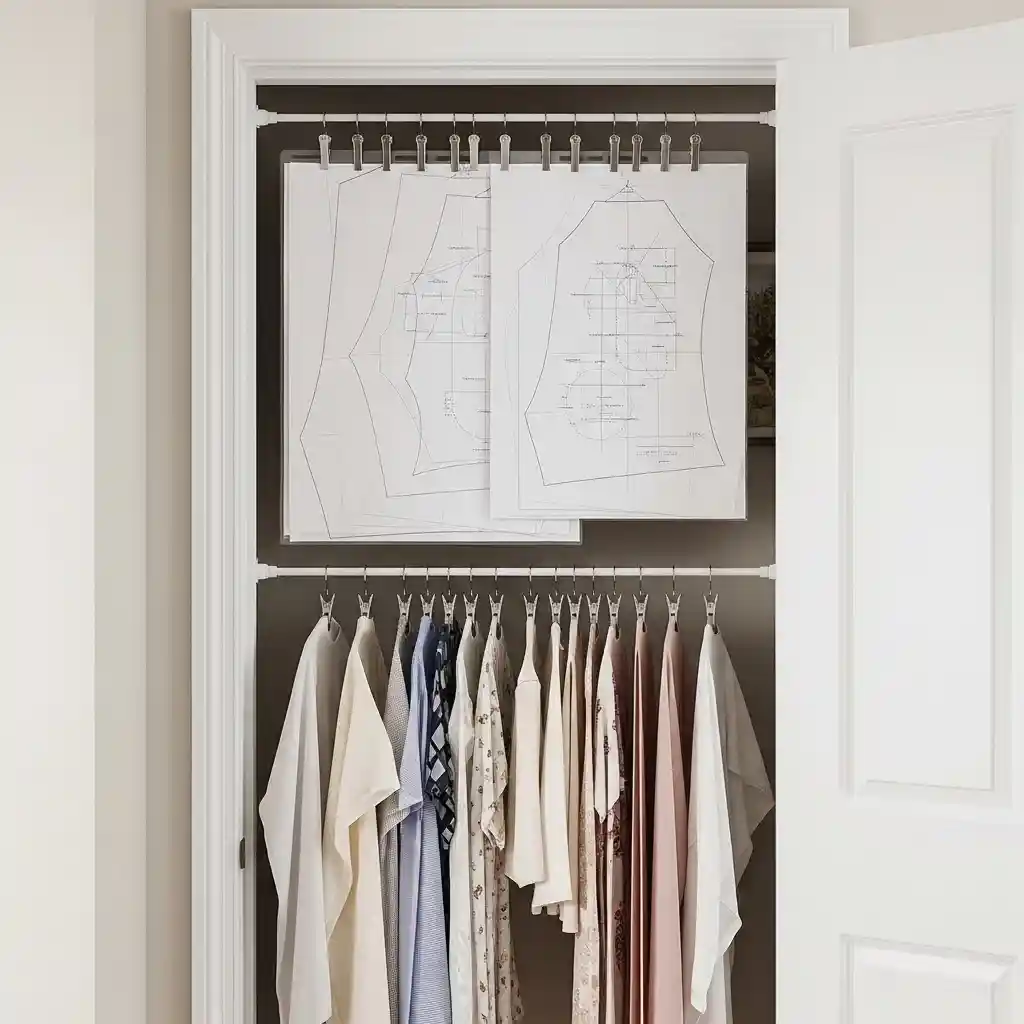 Install tension rods behind doors creating hanging storage for patterns and fabrics. Clip patterns in sheet protectors hanging from pants clips on rods. Hang fabric pieces preventing wrinkles while keeping them visible accessible always. This zero-installation storage uses otherwise wasted behind-door space brilliantly today. Hidden storage like living room category solutions maintains aesthetics.