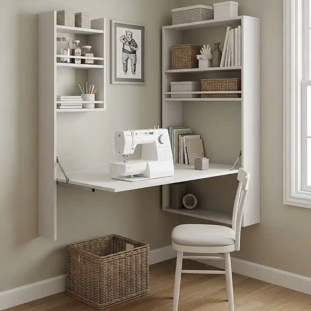 Install a wall-mounted fold-down table creating instant workspace that disappears when not needed. The table folds flat against the wall freeing up floor space completely. Mount your sewing machine on a hinged platform that folds up with the table. This space-saving solution works perfectly in multipurpose rooms requiring flexible furniture arrangements. Similar space efficiency found in hobby room design ideas maximizes functionality beautifully.