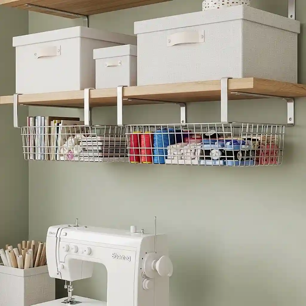 Hang wire baskets underneath existing shelves doubling storage capacity instantly today. These clip-on baskets utilize wasted space beneath shelves holding small supplies. Store frequently used notions in baskets keeping them visible and accessible. The under-shelf location doesn’t consume additional room footprint at all ever. Space multiplication similar to home decor category maximizes existing furniture.