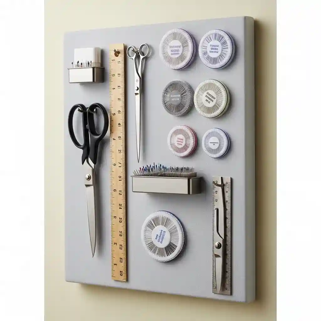 Mount magnetic boards displaying metal tools and notion containers attractively visibly. Small magnetic containers hold pins, needles, and tiny notions organized safely. Metal scissors and rulers attach directly to magnetic surface staying accessible. This vertical storage keeps frequently used items within easy reach always. Magnetic solutions similar to coffered ceiling ideas add functionality creatively.