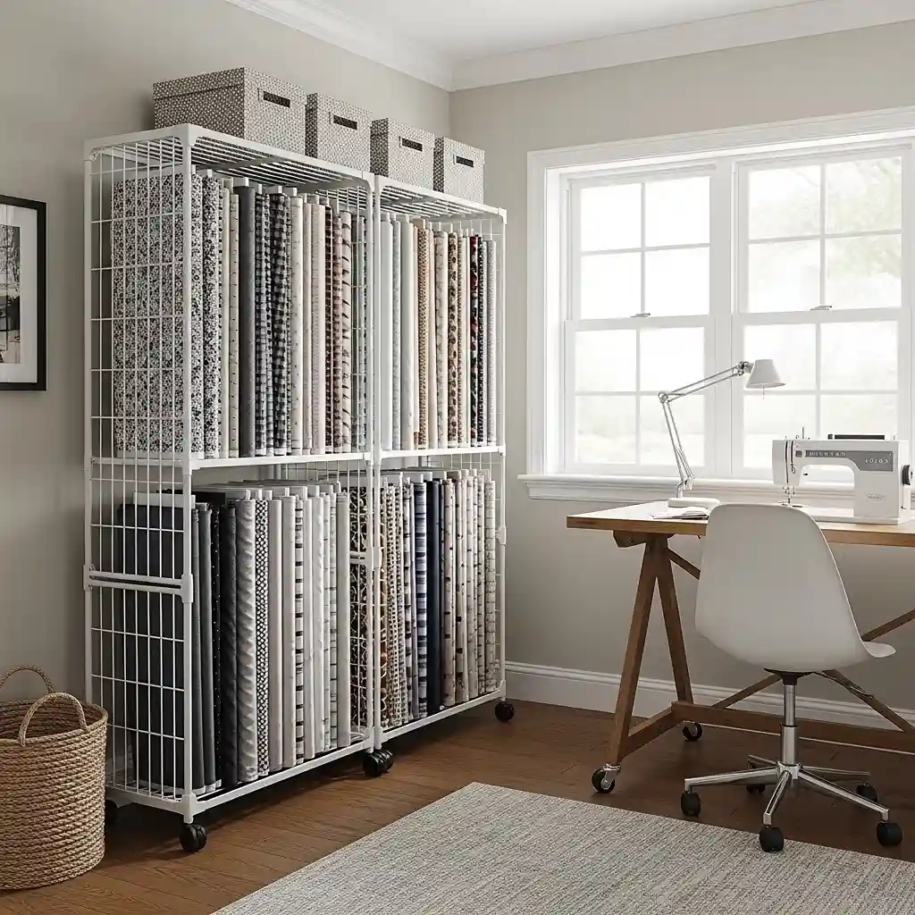 Organize bolts by color creating beautiful rainbow display inspiring projects daily. The rolling feature allows moving fabric stand wherever needed during projects. Store stand in closet or corner when not actively selecting fabrics. This vertical storage prevents fabric creases while maximizing small space efficiency.