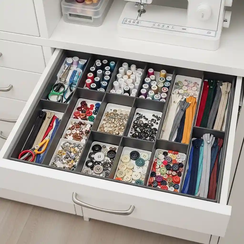 Use shallow compartments for thread organizing by color for quick selection. Deeper sections hold scissors, rotary cutters, and measuring tools safely organized. Adjustable dividers adapt as your supply collection grows or changes over time. Organized drawers eliminate frustrating searches letting you focus on creative sewing.
