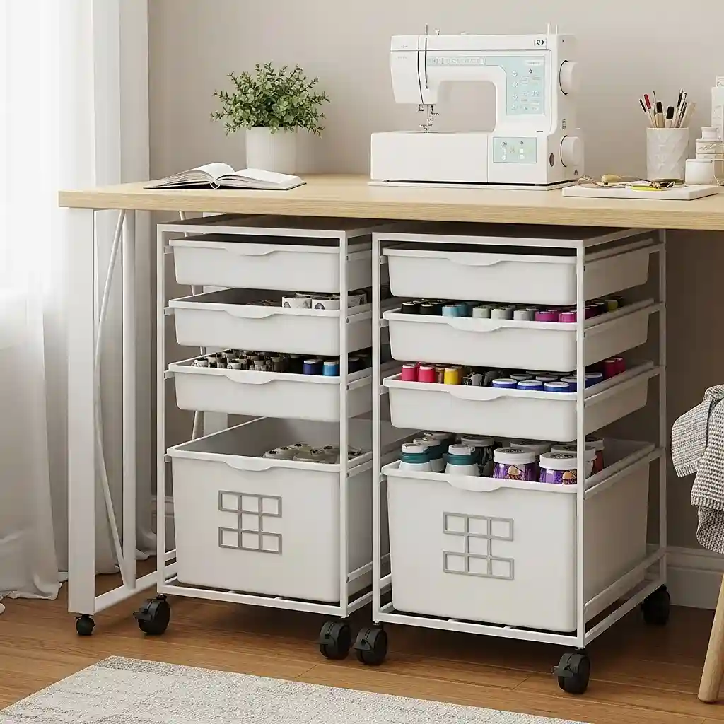 Place rolling drawer units under your sewing table creating hidden accessible storage instantly. The wheels allow easy movement when accessing supplies stored inside each drawer. Choose units that fit perfectly under your table height maximizing space usage. Rolling storage provides flexibility moving supplies exactly where needed during projects. Mobile solutions like living room category furniture adapt to needs.