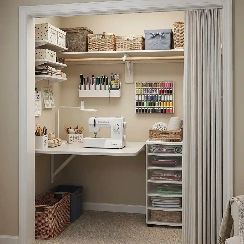 Transform a bedroom closet into a compact dedicated sewing room instantly today. Remove closet doors installing curtains or folding doors saving space when open. Mount a fold-down table or permanent countertop at comfortable working height. Install shelving above and around workspace storing all supplies within arm’s reach. Converted spaces similar to bedroom category maximize every inch.