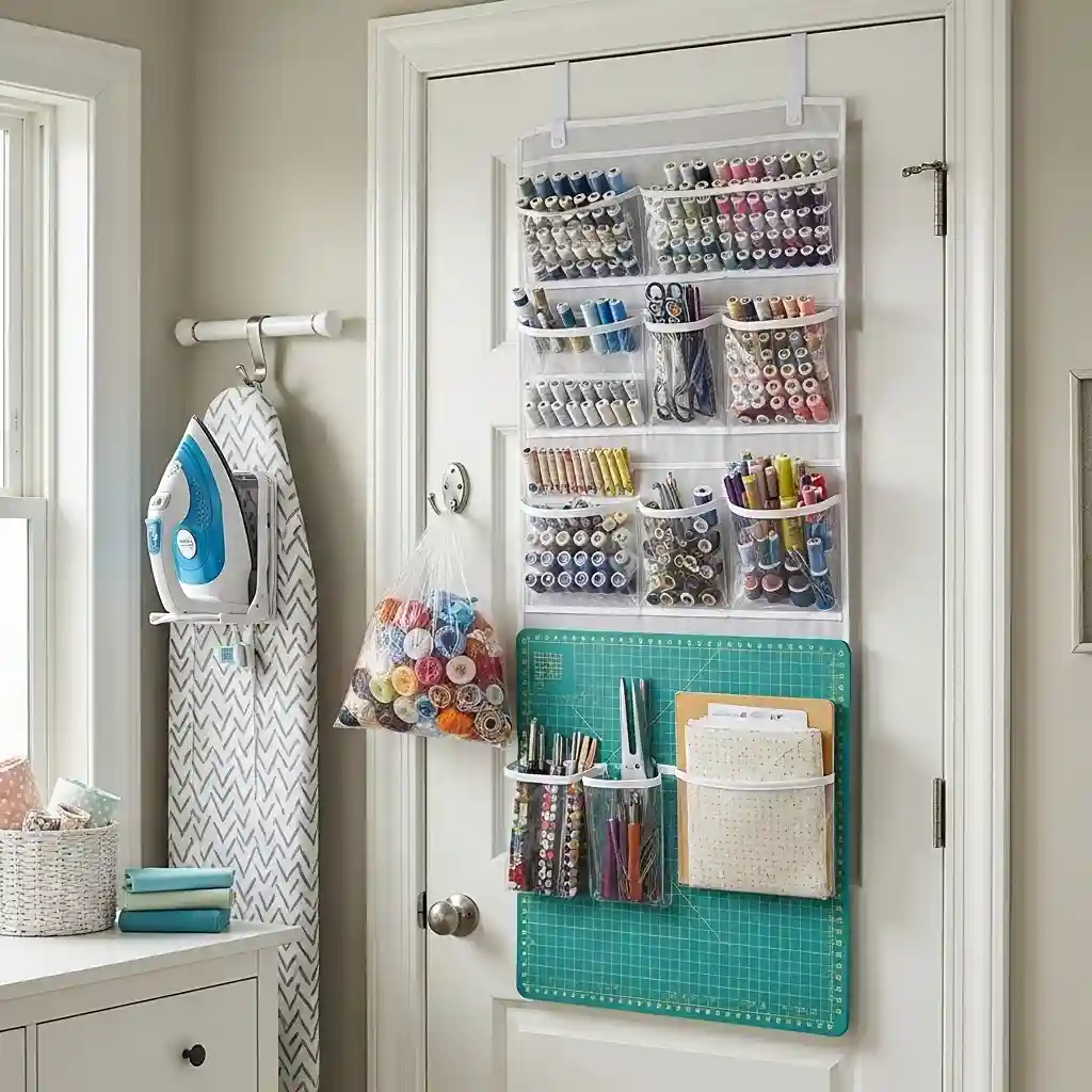Use clear organizers for thread allowing instant color identification without searching pockets. Store frequently used scissors, seam rippers, and measuring tapes in accessible pockets. Hang cutting mats and rulers keeping them flat preventing warping over time. Over-door storage keeps supplies organized visible accessible without consuming precious floor space.