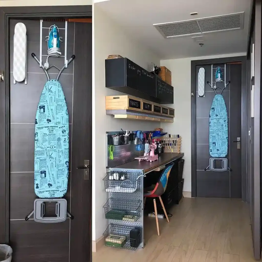 Mount a wall-mounted ironing board that folds flush against wall when unused. Install near your sewing machine minimizing movement between sewing and pressing tasks. Add small shelf above holding iron and pressing tools within reach. The fold-away design eliminates bulky floor-standing ironing board storage completely. Space-saving installations like cheap DIY ceiling ideas maximize efficiency.